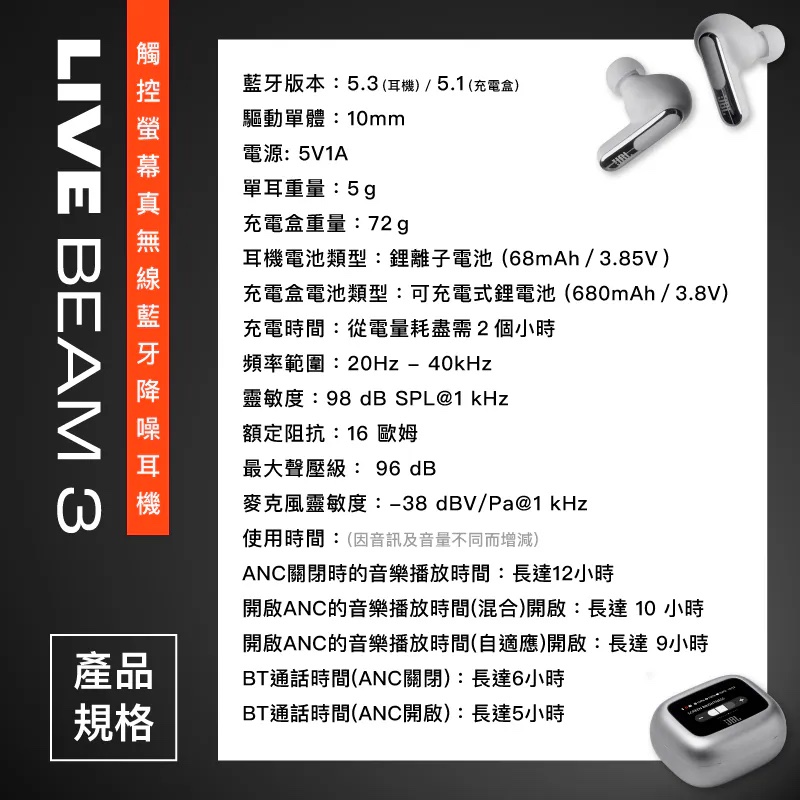 【JBL】Live Beam 3 輕旗艦 觸控螢幕真無線藍牙降噪耳機