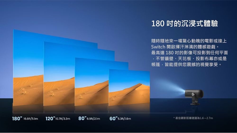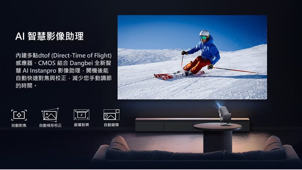 •自動梯形校正、對焦、避障、銀幕對齊,開機立即使用。