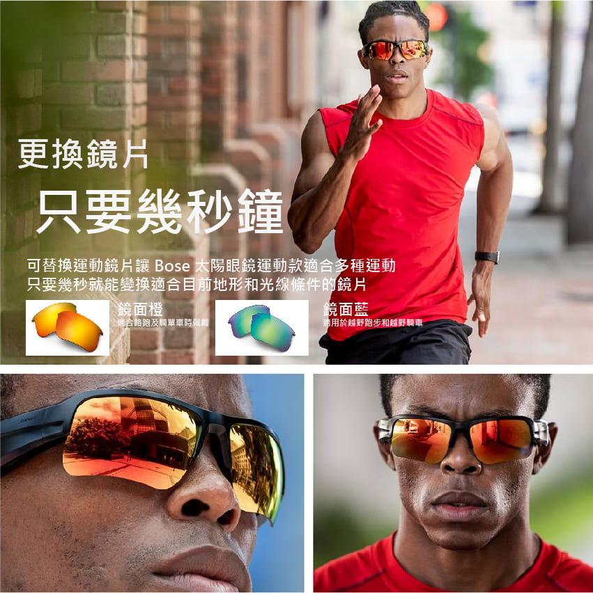 ● 替換運動鏡片讓 Bose 太陽眼鏡運動款適合多種運動。只要幾秒就能變換適合目前地形和光線條件的鏡片