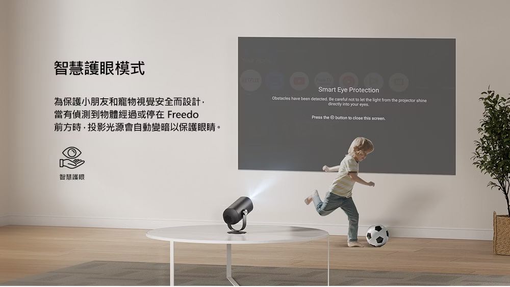 •自動梯形校正、對焦、避障、銀幕對齊,開機立即使用。