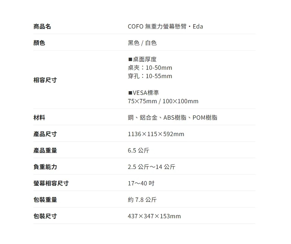 【COFO】無重力螢幕懸臂・Eda(上下臂)