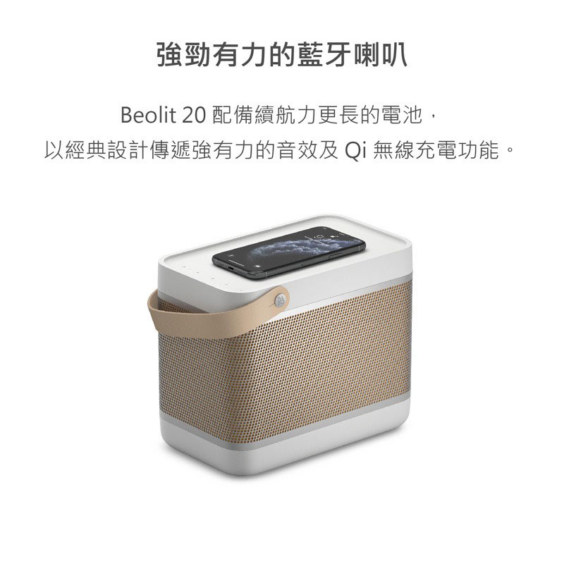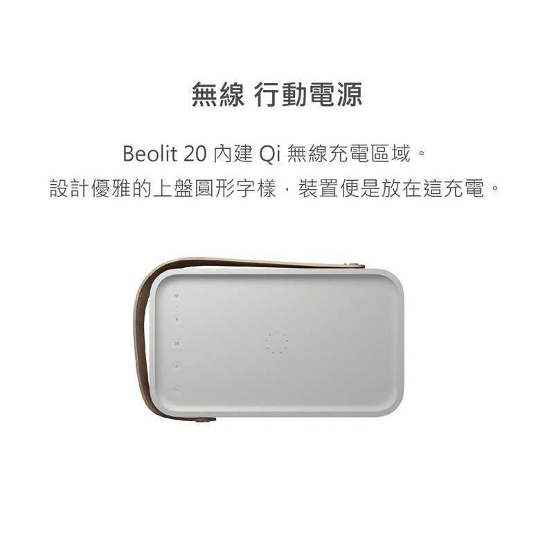 ● Beolit 20 及其內建無線充電台可為與 Qi 相容的電話和裝置充電
