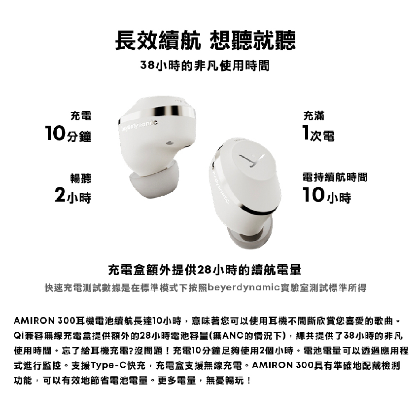 ● 長達 38 小時的續航時間,相容 Qi 快速充電